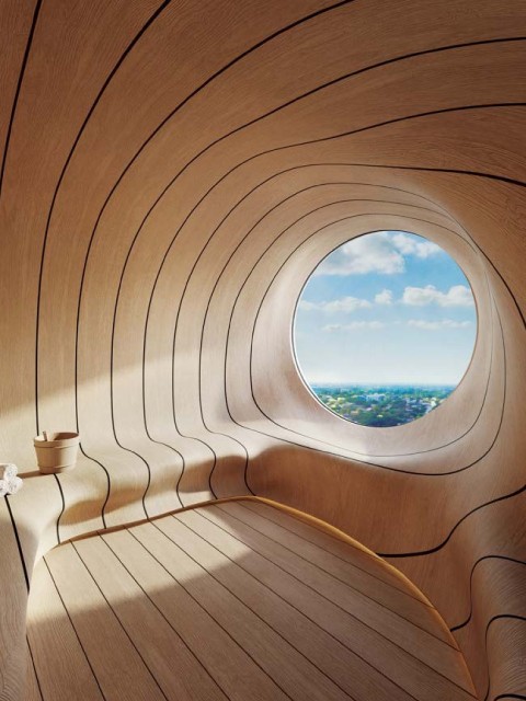 Elegant and innovative, a suite of wellness spaces encourages holistic health and unfettered relaxation. JEM’s cocoon-like sauna is fashioned from undulating wood, with a porthole that looks out onto the urban landscape below.